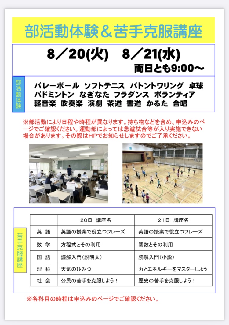 夏休み部活動体験・苦手克服講座 6月~予約開始