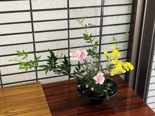 10月はカーネーション、紫クジャク草、オンシジュームの生け花が玄関に飾られています。