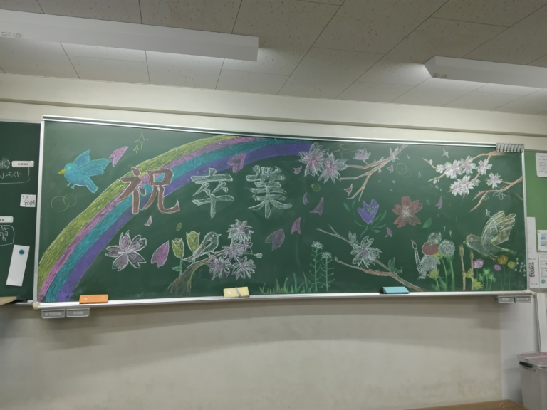 本日、予餞会が行われました。 1.2年生が3年生のために様々な発表を行い、会場を盛り上げました。 美術部が手掛けた黒板アートをご覧ください。 -