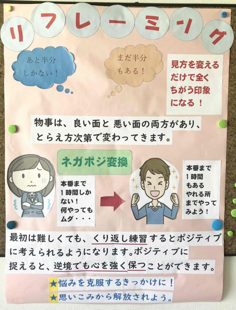 養護教諭が、全校生徒に向けてリフレーミングの紹介を掲示しています。 -