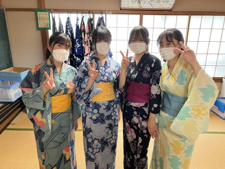2年生の家庭基礎の授業では、浴衣の着付けが行われていました。