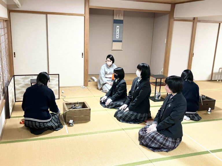 本校の茶道同好会では、先生をお呼びしてお茶の点て方や作法を学んでいます。 -